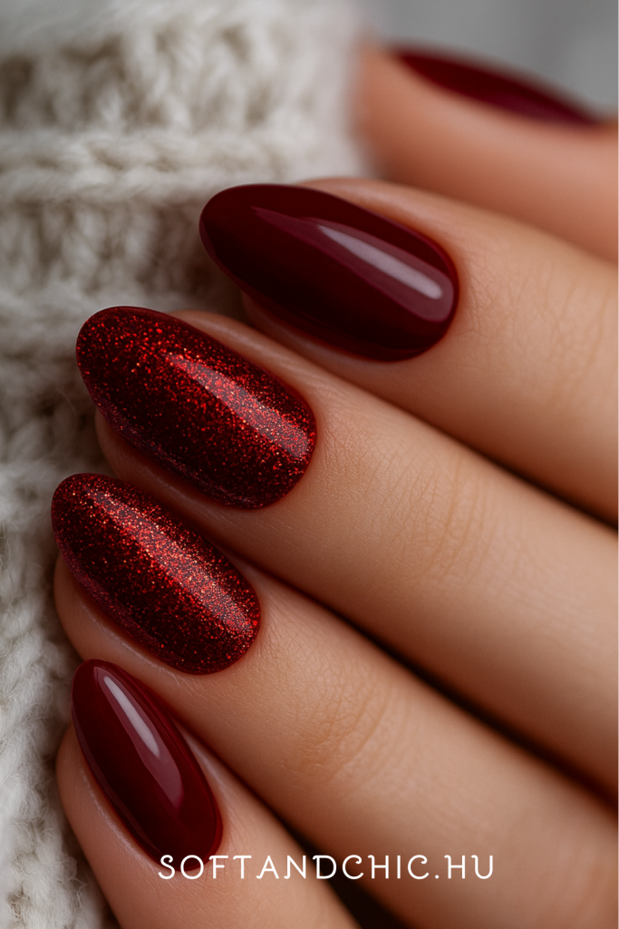 A klasszikus ünnepi vörös (rubin, burgundi) árnyalatokat finoman csillámos bevonattal bolondítják meg a karácsonyi körmöket. A shimmer lehet arany folt, mikropor vagy finom fényfényezés. A cél az, hogy a körmök ne csak simák legyenek, hanem fényben is gyönyörködtessenek.