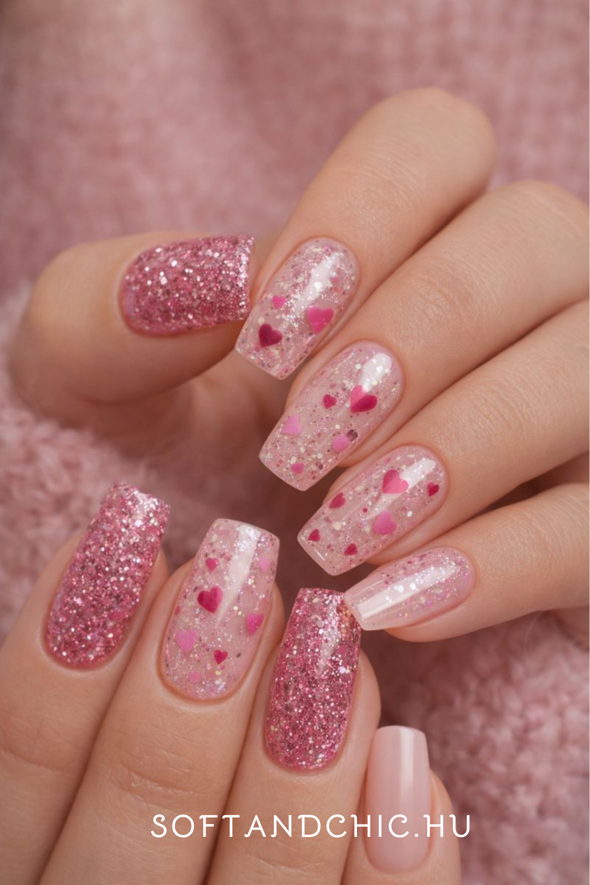 - A glittery pink base decorated with hearts – elegant and refined.
