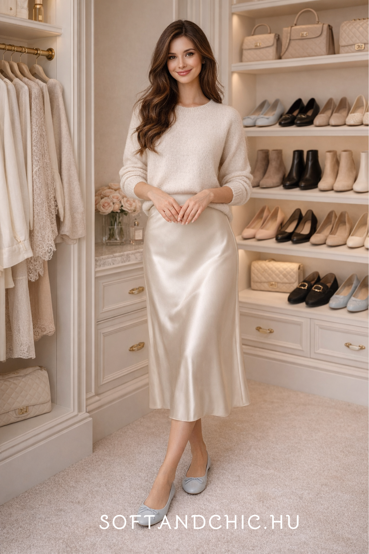 Cream sweater + satin midi skirt + ballet flats